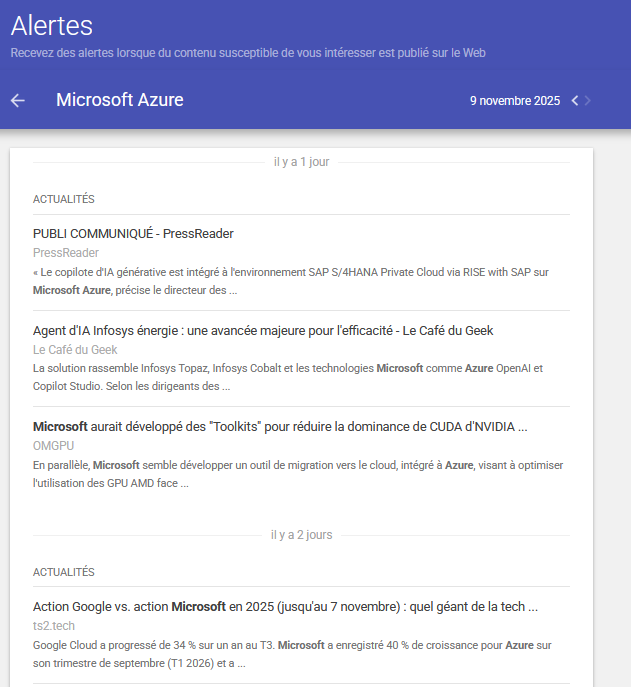 Pour réaliser ma veille technologique sur Microsoft Azure, j’ai mis en place plusieurs sources d’information complémentaires. J’ai configuré Google Alerts afin de recevoir automatiquement les actualités liées au cloud Microsoft. J’ai rejoint le groupe Azure Practitioners sur LinkedIn ainsi que différents forums et communautés dédiés sur Reddit, ce qui me permet de suivre les échanges entre professionnels. Je complète cette veille par des contenus spécialisés, notamment les vidéos de John Savill, un créateur reconnu dans l’écosystème Azure. Grâce à cet ensemble de ressources, ma veille est régulière, variée et orientée vers les usages réels de la plateforme.
